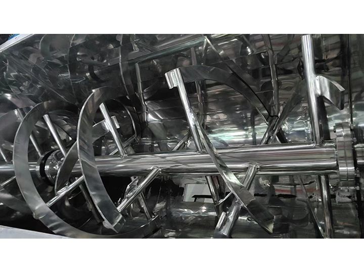 外螺旋帶盤繞形式配合旋轉方向把物料從兩端向中間推動,而內螺旋帶把物料從中間向兩端推動,形成對流混合,物料在相對短時間內混合均勻,設備應用于干粉、顆粒、液體與低粘度的漿料。