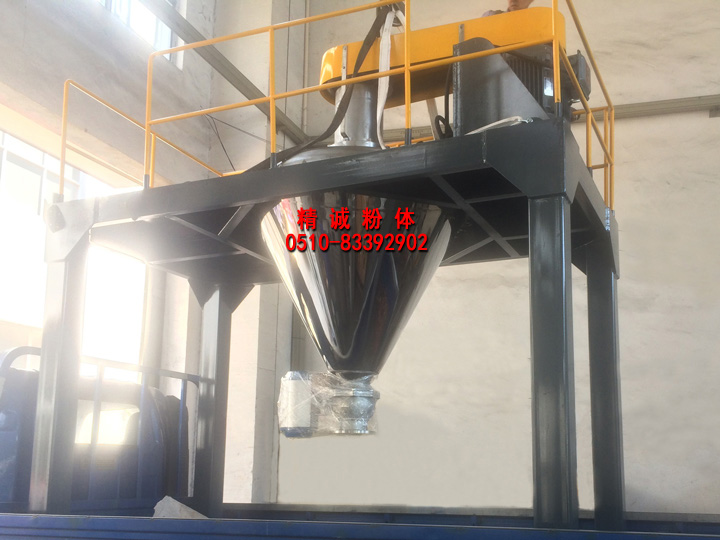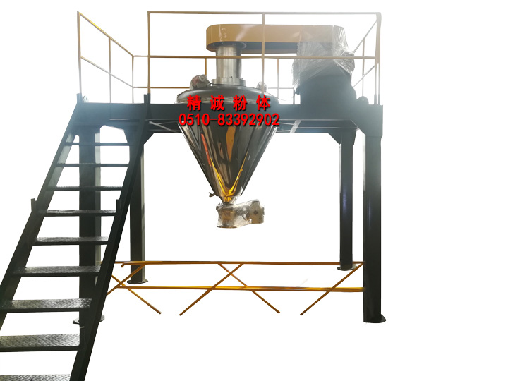 該混合機具有錐形混合膠體,并配有中心轉軸,通過轉軸的速度產生離心力將粉料推向混合膠體內壁。此時腔體的錐形形狀使粉體產生一個沿內壁向上的運動。粉料再由混合機改引導到混合機的中心,并回落到混合腔的地步,重新開始新一輪的混合過程。