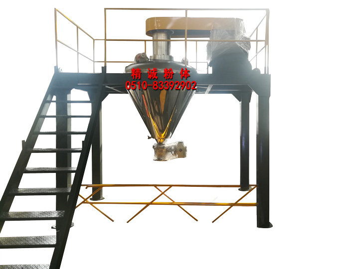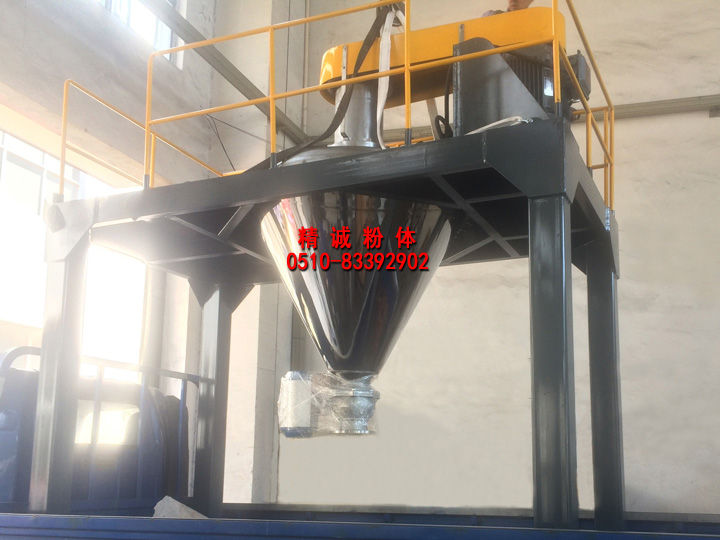 產(chǎn)品通過錐形混合腔頂部投入,投料范圍在30%-99.99%之間,設(shè)備中間有一個(gè)頂部驅(qū)動(dòng)的高速轉(zhuǎn)軸,因此便去除了在產(chǎn)品區(qū)域的密封設(shè)計(jì)以及軸承。在軸上有緊貼內(nèi)壁的槳式混合原件。通過高速旋轉(zhuǎn)的攪拌槳和錐形內(nèi)倉(cāng)的共同作用將產(chǎn)品由底部帶至混合腔的上部。當(dāng)產(chǎn)品達(dá)到頂部的時(shí)候又重新回落到混合倉(cāng)中心,如此的產(chǎn)品的方式形成了一種快速的宏觀混合。