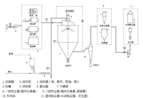 空氣通過過濾器和加熱器,進入干燥器頂部的空氣分配器,熱空氣呈螺旋狀均勻進入干燥器。料液由料液槽經過濾器由泵送至干燥器的離心霧化器,使料液噴成小的霧狀液滴,料液和熱空氣并流接觸水分迅速蒸發,在短時間內干燥為粉末狀成品。成品由干燥塔和旋風分離器排除,廢氣由風機排出。