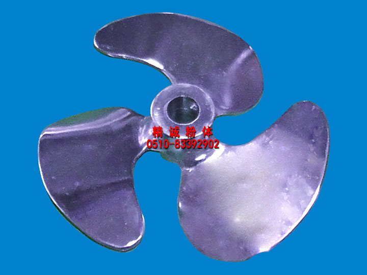 旋槳式攪拌器由2~3片推進式螺旋槳葉構成,工作轉速較高,葉片外緣的圓周速度一般為5~15m/s。旋槳式攪拌器主要造成軸向液流,產生較大的循環量,適用于攪拌低粘度(<2Pa·s)液 體、乳濁液及固體微粒含量低于10%的懸浮液。攪拌器的轉軸也可水平或斜向插入槽內,此時液流的循環回路不對稱,可增加湍動,防止液面凹陷。